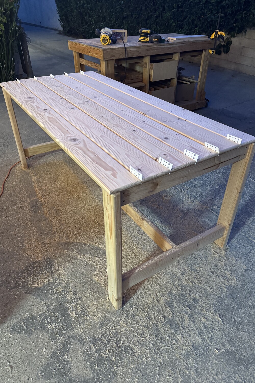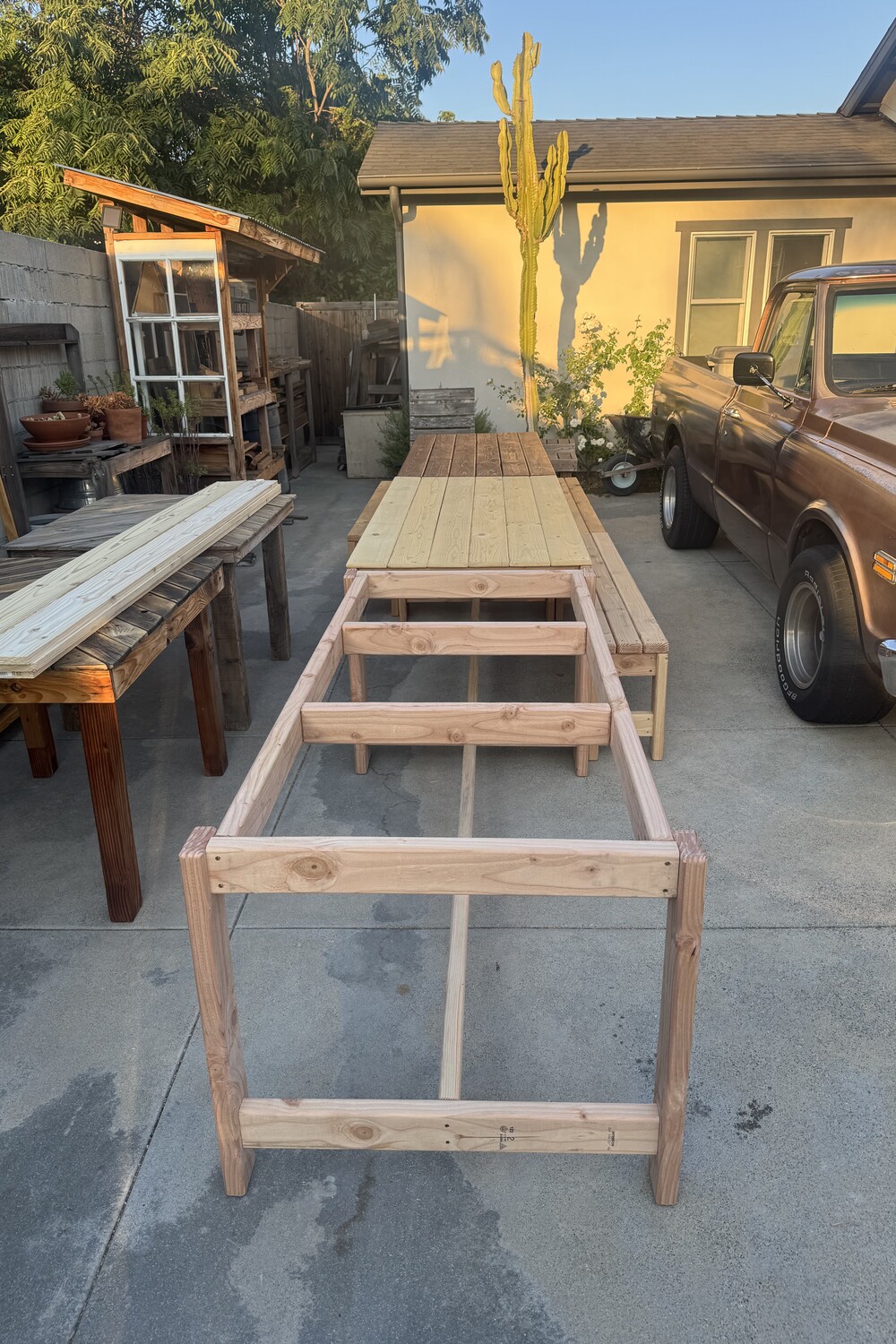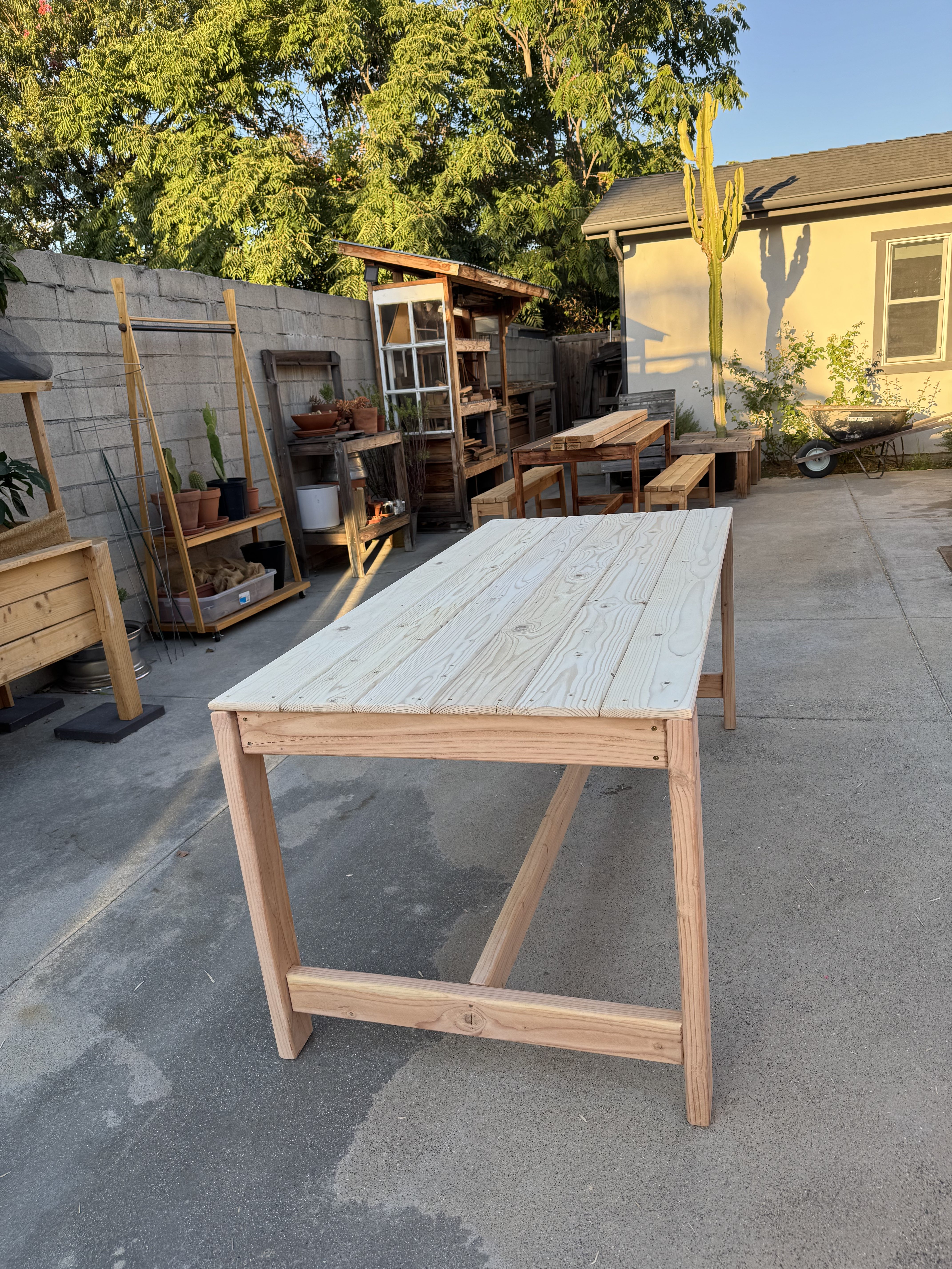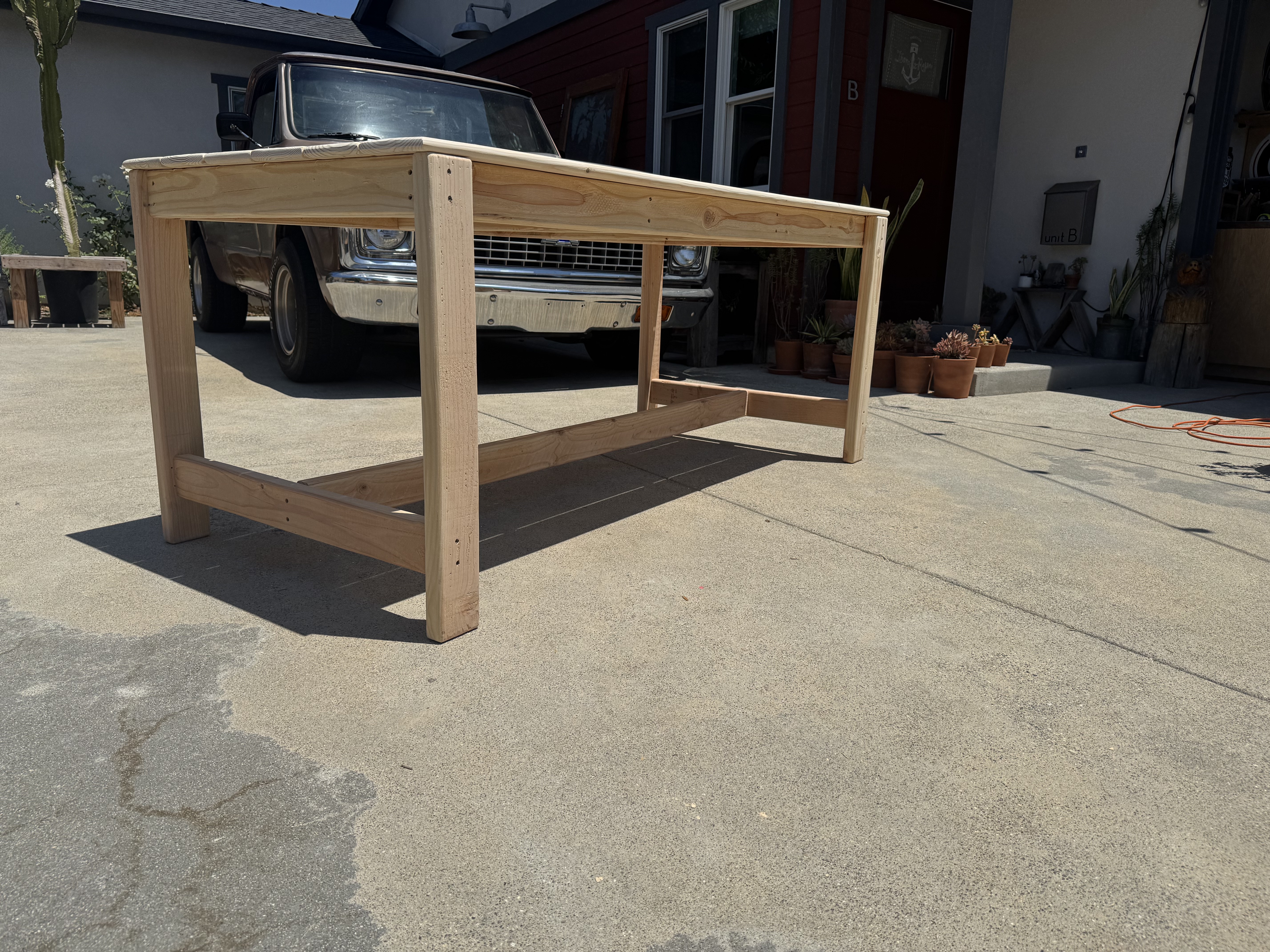 The plans are adapted from Ana White’s farmhouse table tutorials (video 1, video 2), which are beginner-friendly and use basic dimensional lumber.