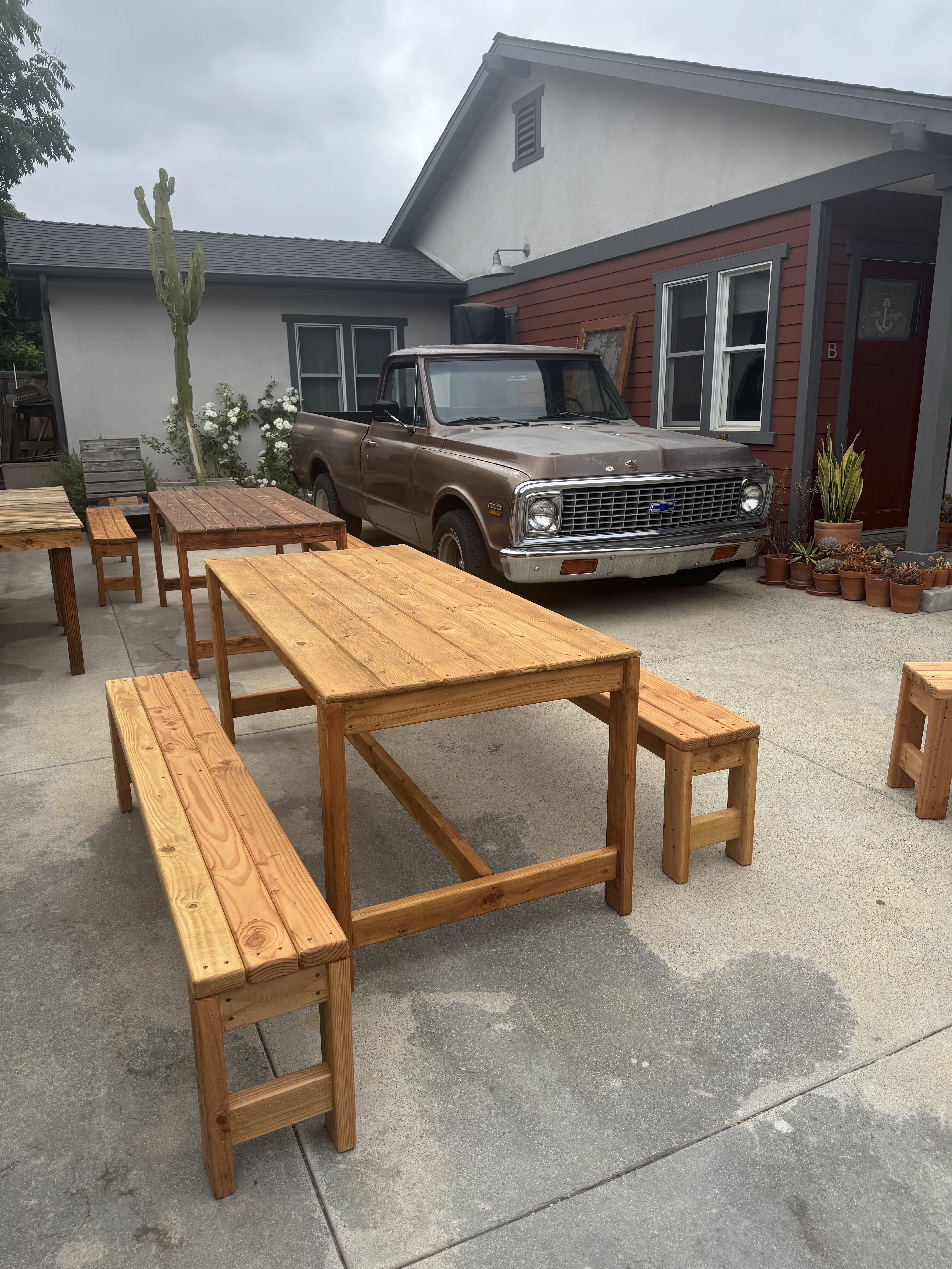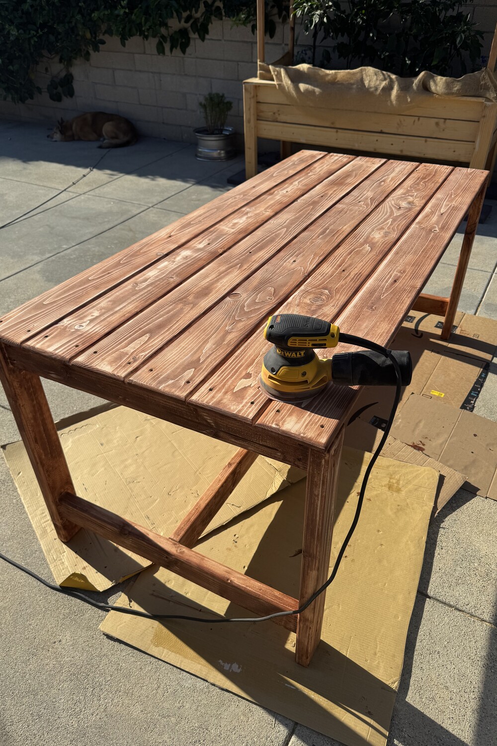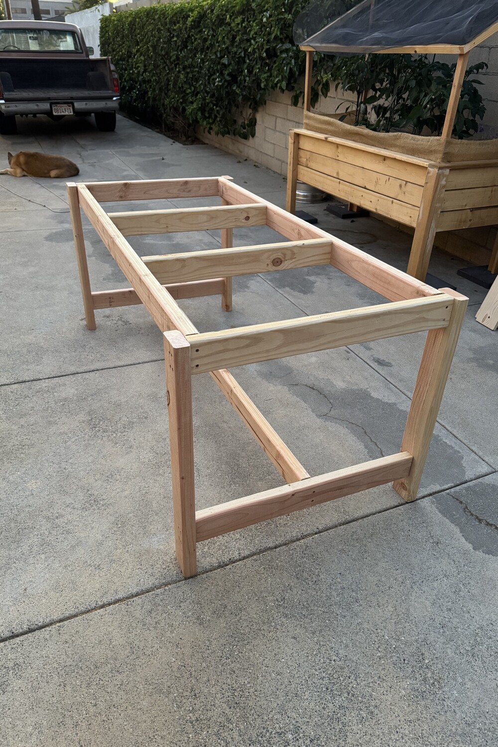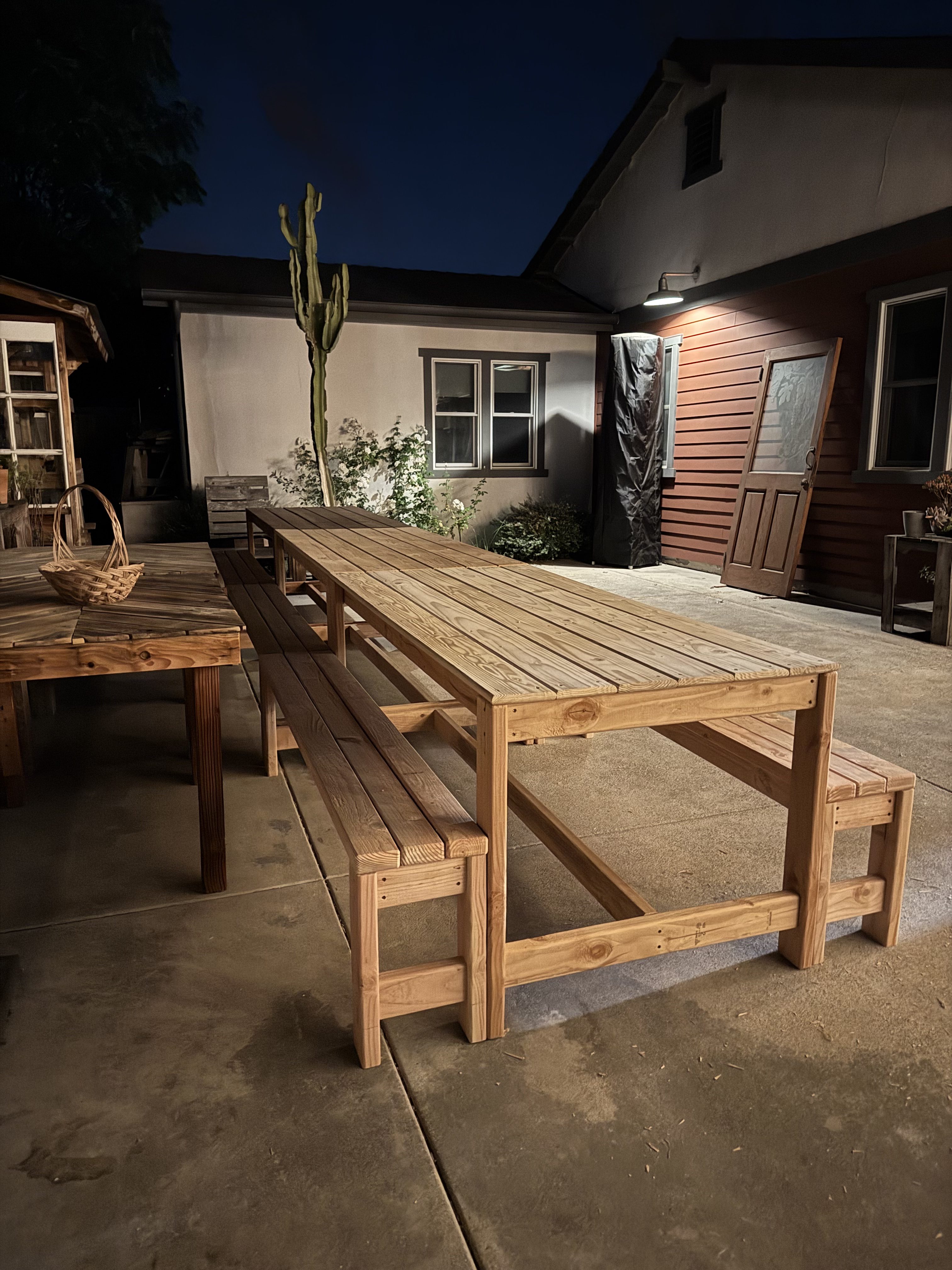 The plans are adapted from Ana White’s farmhouse table tutorials (video 1, video 2), which are beginner-friendly and use basic dimensional lumber.