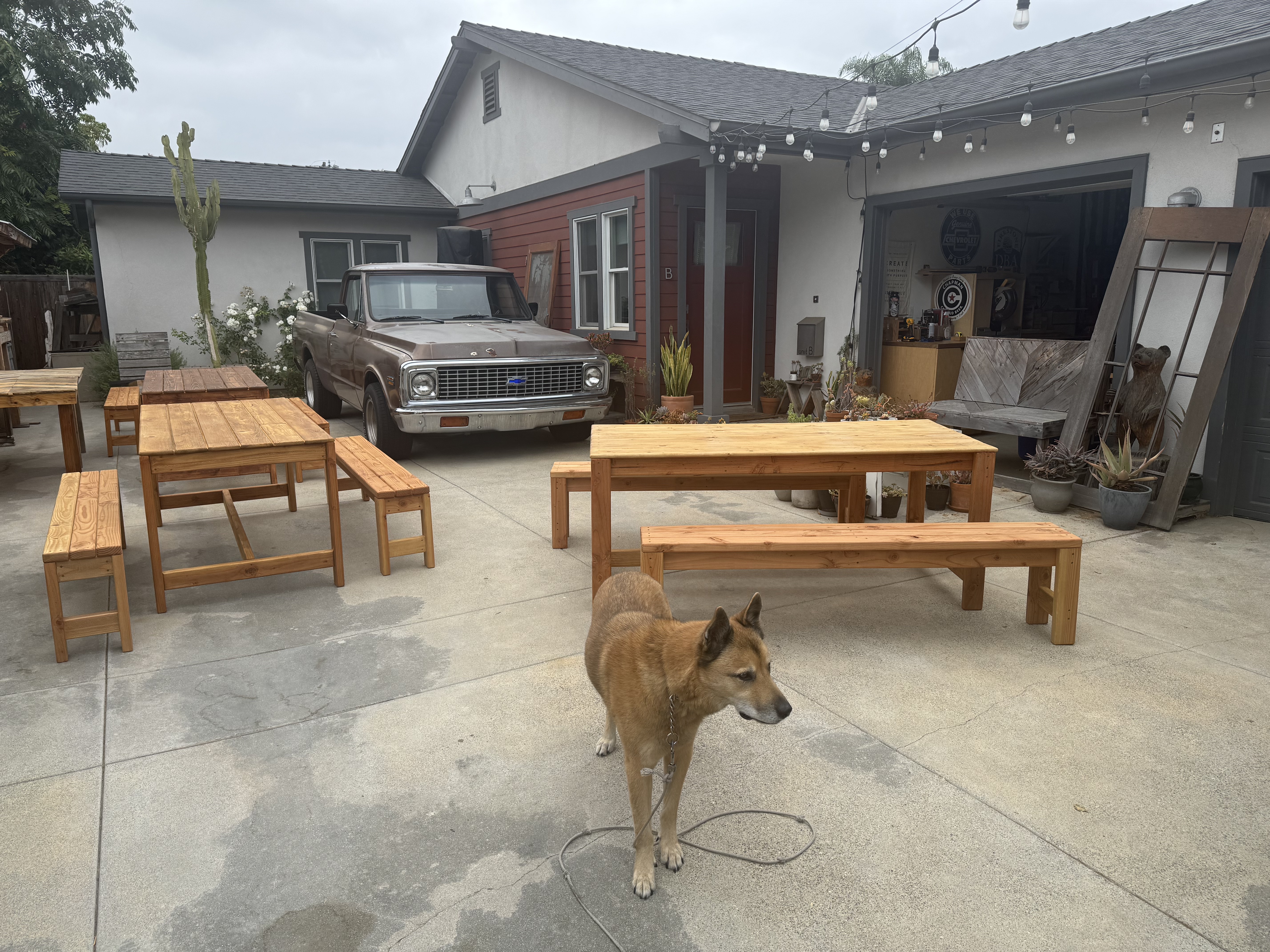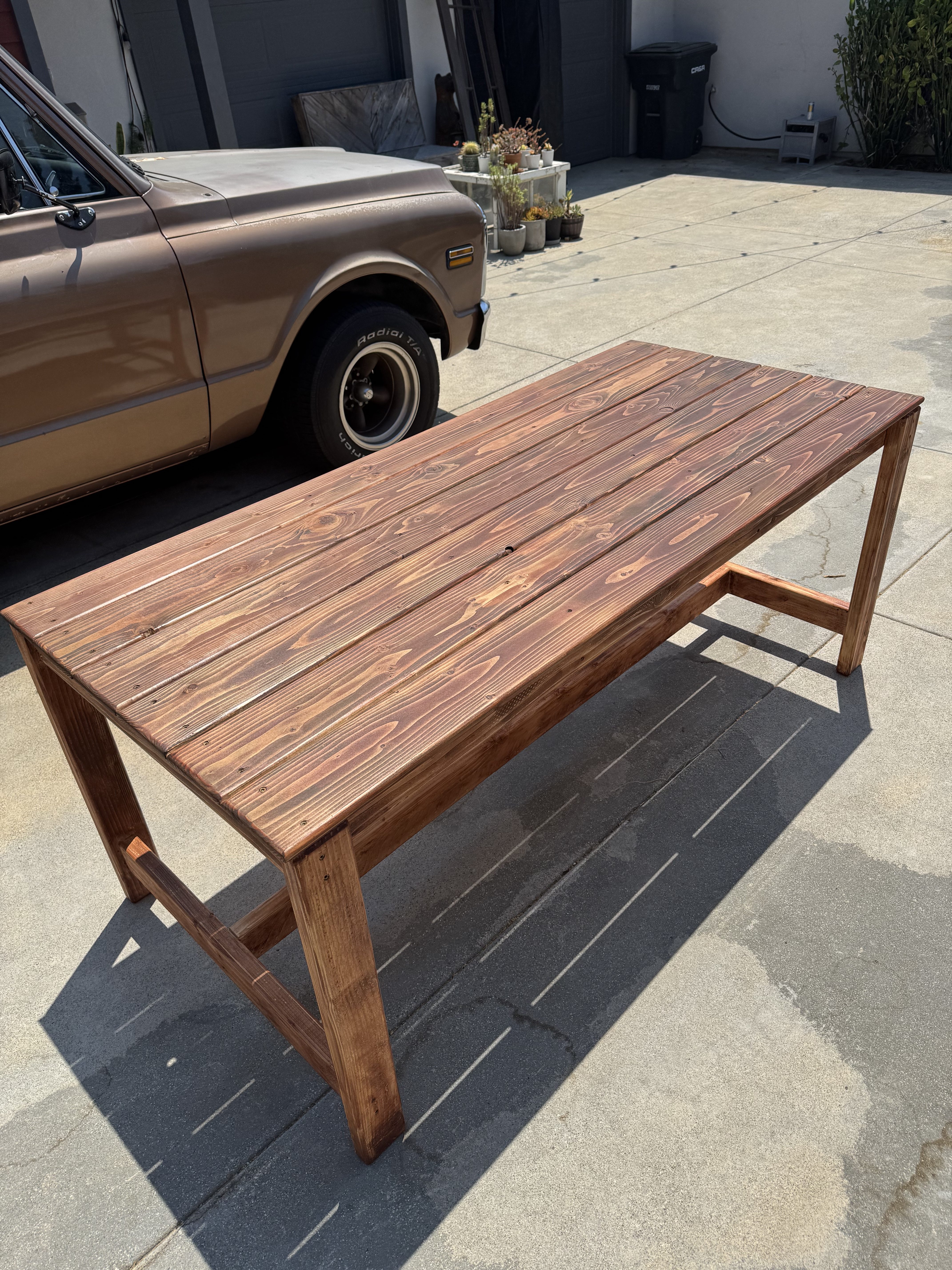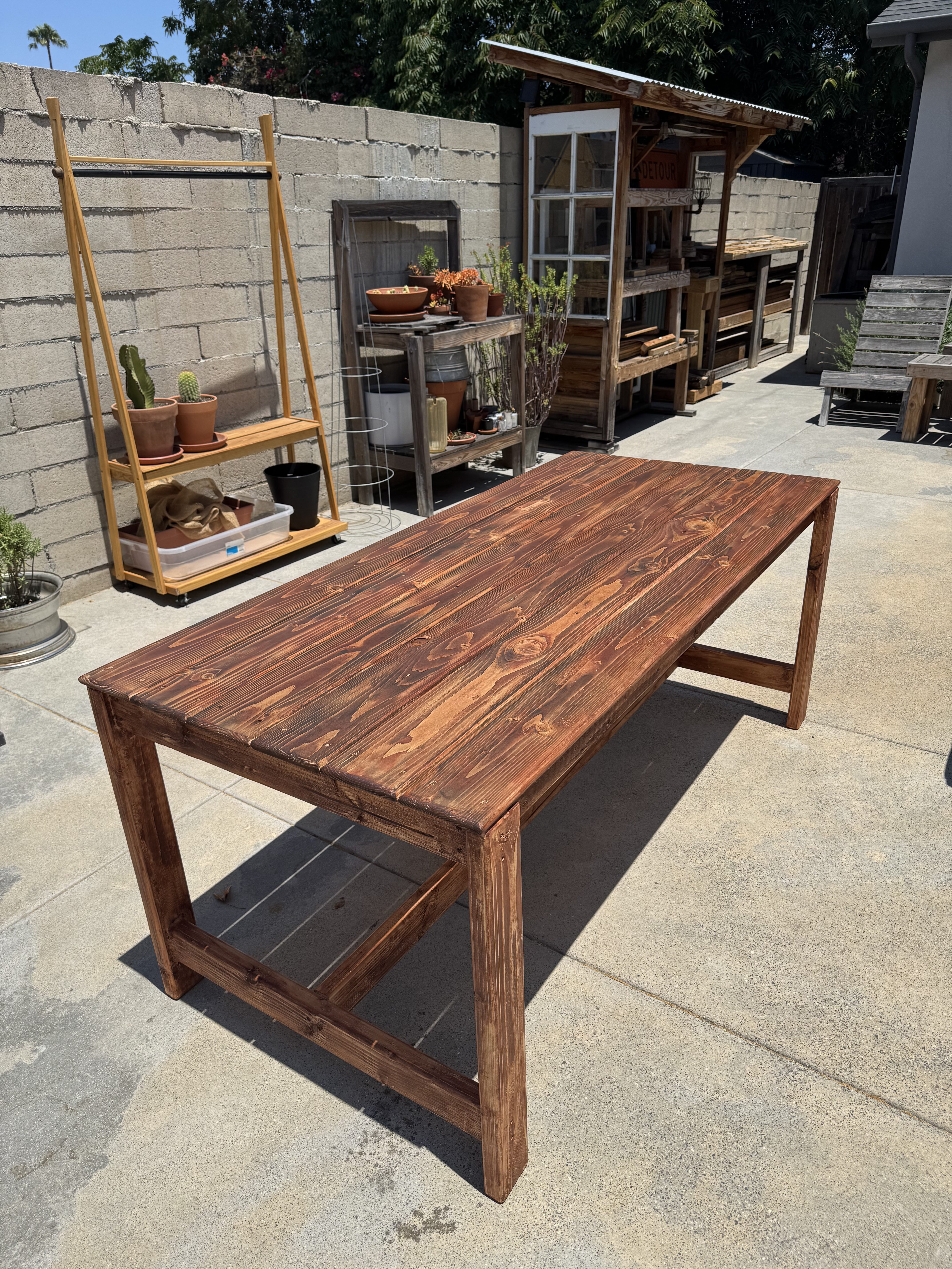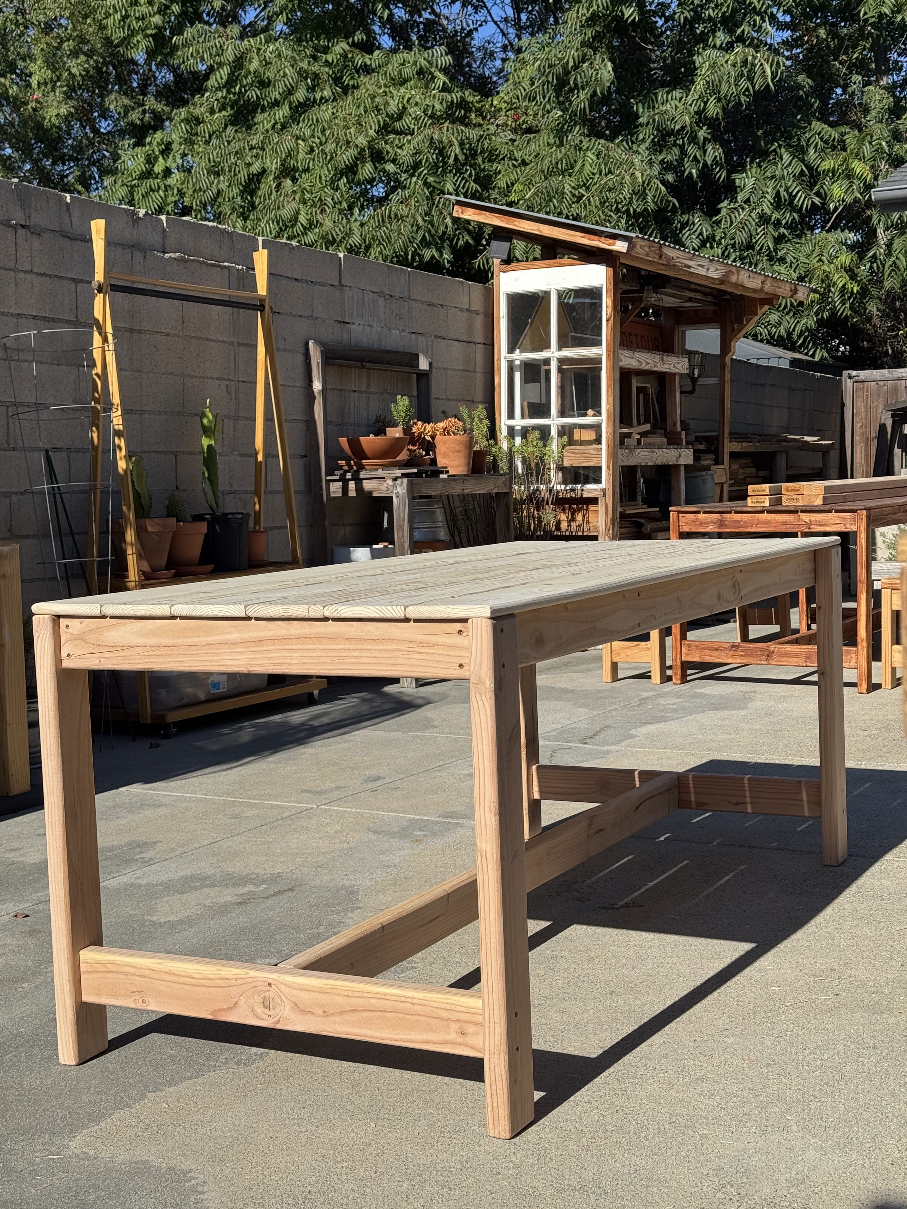 The plans are adapted from Ana White’s farmhouse table tutorials (video 1, video 2), which are beginner-friendly and use basic dimensional lumber.